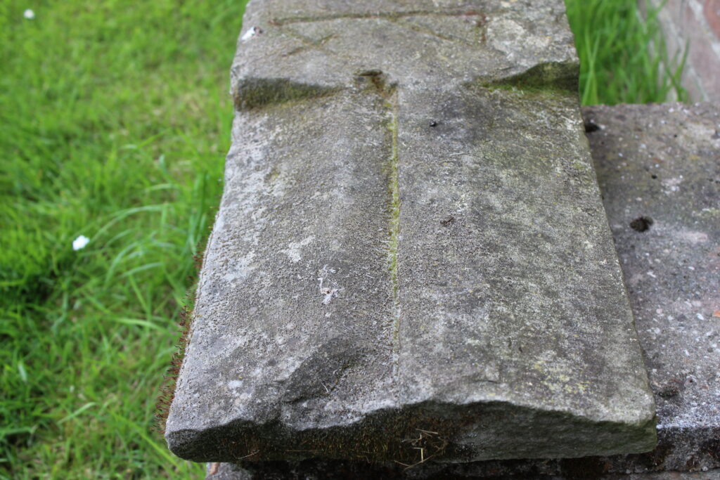 Het bouwfragment van 51 bij 27 cm is van zandsteen en is vermoedelijk gemaakt als onderdorpel. De dorpel werd oorspronkelijk aangebracht in de dagkant van een bakstenen klooster- of kruisvenster waar het glas direct in de muursponning werd geplaatst. Dit type venster werd tot de eerste helft van de 17e eeuw toegepast. Op het bouwfragment is een relatief groot steenhouwersmerk herkenbaar op het voegvlak. Het merk komt overeen met een merk dat in de Pancratiuskerk te Haaksbergen (ca 1500-1520) aangetroffen is. Helaas kennen we de naam van de betreffende steenhouwer niet. Hij kan een steenhouwer uit de groeven van Gildehaus zijn; een vensterdorpel is een product dat kant en klaar per strekkende voet vanuit de groeve geleverd werd. Hiermee kan het bouwfragment worden gedateerd op 16e eeuws. Waar het fragment toegepast is geweest, is helaas niet bekend. Misschien is het afkomstig uit het klooster van Wittewierum, maar een andere herkomst is ook mogelijk.